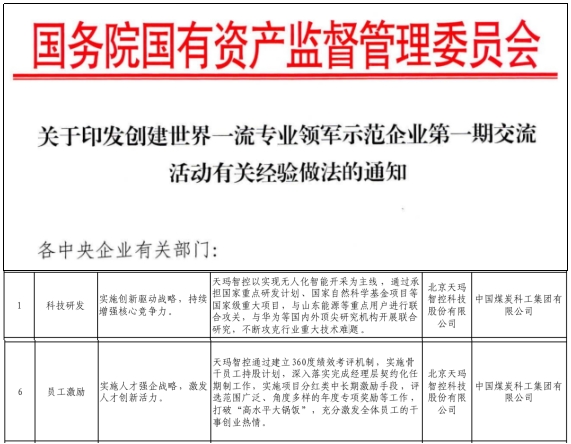 近日,国务院国资委发布《关于印发创建世界一流专业领军示范企业第一期交流活动有关经验做法的通知》,天玛智控2项经验做法成功入选清单。