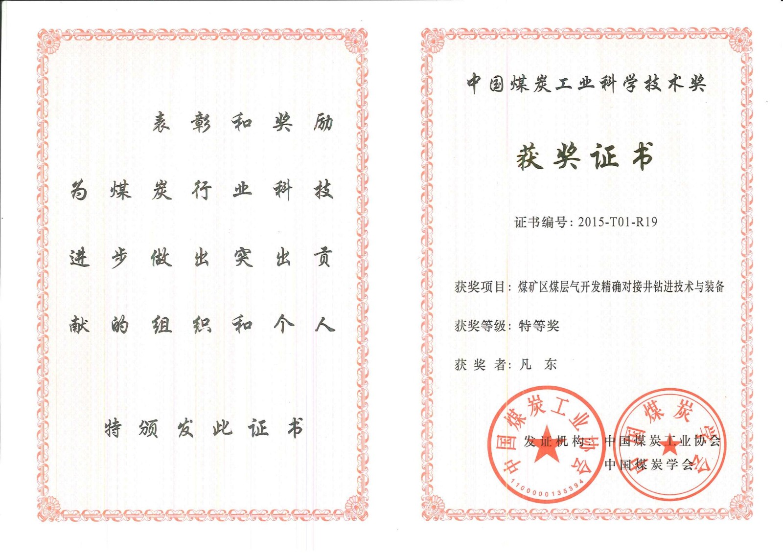 7.煤矿区煤层气开发精确对接井钻进技术与装备,中国煤炭工业科学技术特等奖,2015年,排名第19,中国煤炭工业协会、中国煤炭学会;
