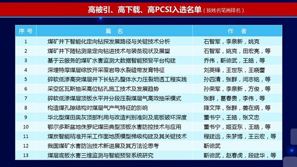2022年10月,中国知网《学术精要数据库》发布2011—2021年高影响力论文统计结果。西安研究院共计910篇论文入选,其中,高被引论文104篇、高下载论文37篇、高PCSI论文135篇,同时获高被引、高下载、高PCSI的论文共20篇;以西安研究院为第一单位的有13篇,这13篇论文主要是围绕西安研究院在煤层气地质与勘探开发、水害防治与资源保护、智能钻探与智能物探技术与装备研发等主业方向的研究成果,也凸显了西安研究院在煤矿地质保障技术领域所做出的主要贡献。