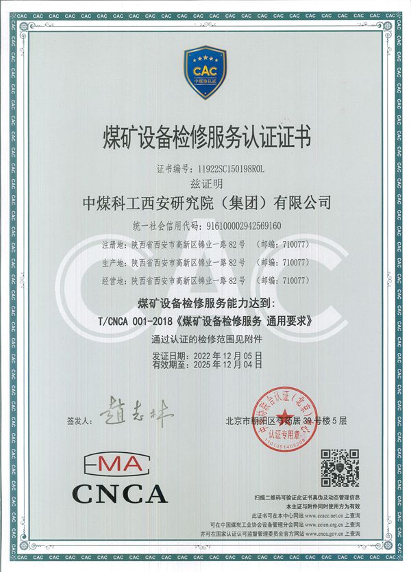 12月5日,西安研究院正式通过煤矿设备检修服务认证,获得由中煤协联合认证(北京)中心颁发的煤矿设备检修服务认证证书,认证范围覆盖钻机、采煤机、掘进机、液压支架等16种煤机设备。此项认证通过表明西安研究院具备了常用煤机设备的检验维修资质,也是西安研究院积极推进产业升级、大力发展绿色再制造产业的里程碑。