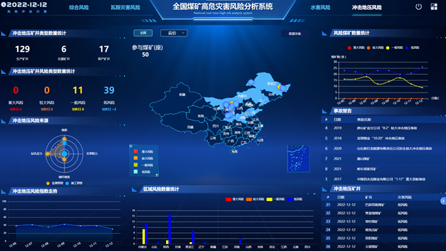 该分析评估系统依托国家应急云进行开发、部署,通过构建区域和煤矿不同层级的冲击地压风险指标体系与评价模型,以“一张图”的形式实时展示全国、重点省份、重点矿井多个层级的冲击风险;能够量化冲击地压矿井风险底数,清晰掌握接入矿井冲击地压的风险底数和变化趋势,实现了煤矿冲击地压的风险动态分析和预知预判。其突出特点是,通过内置“矿井基础信息”“生产信息”和“监测信息”三类数据的指标模型,构建了专业的冲击地压风险判识指标库和模型库,能够对冲击地压灾害的10大类监测数据和60余项核心评价指标进行差异化的判断、分析,可有效提高冲击地压灾害风险识别的准确率。