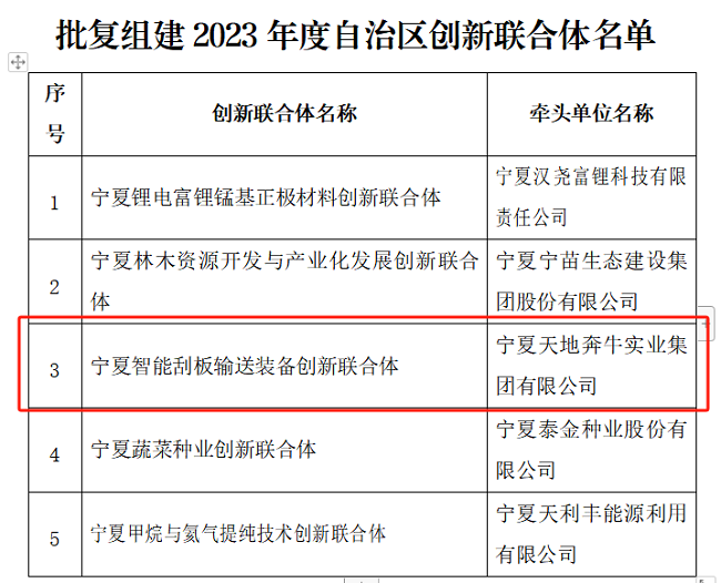 近日,宁夏回族自治区科学技术厅发布了《自治区科技厅关于批复组建2023年度自治区创新联合体的通知》,正式批复天地奔牛牵头组建“宁夏智能刮板输送装备创新联合体”。