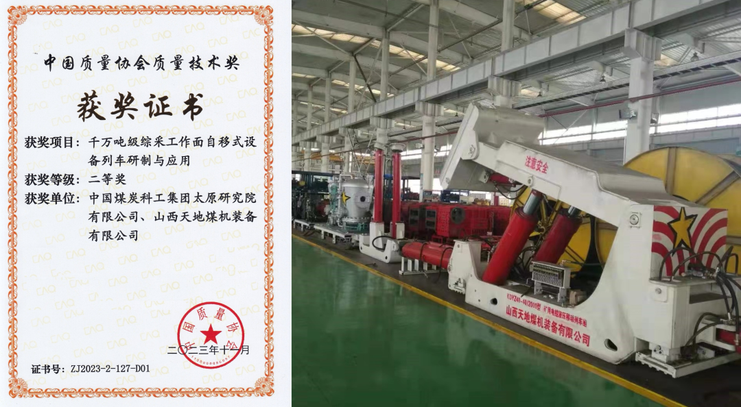 继山西煤机科研项目《EML300Y(340A)窄型连续采煤机的研制》获“2020年度中国质量技术奖”优秀奖,近日,《千万吨级综采工作面自移式设备列车研制与应用》和《矿用智能纯电动铲运机质量提升关键技术研究及应用》再次分获“2023年度中国质量技术奖”二等奖和优秀奖。