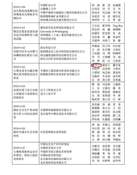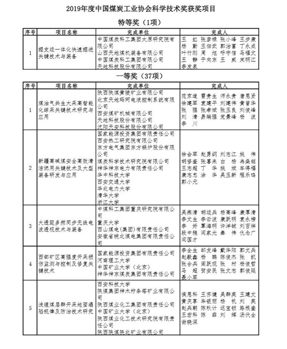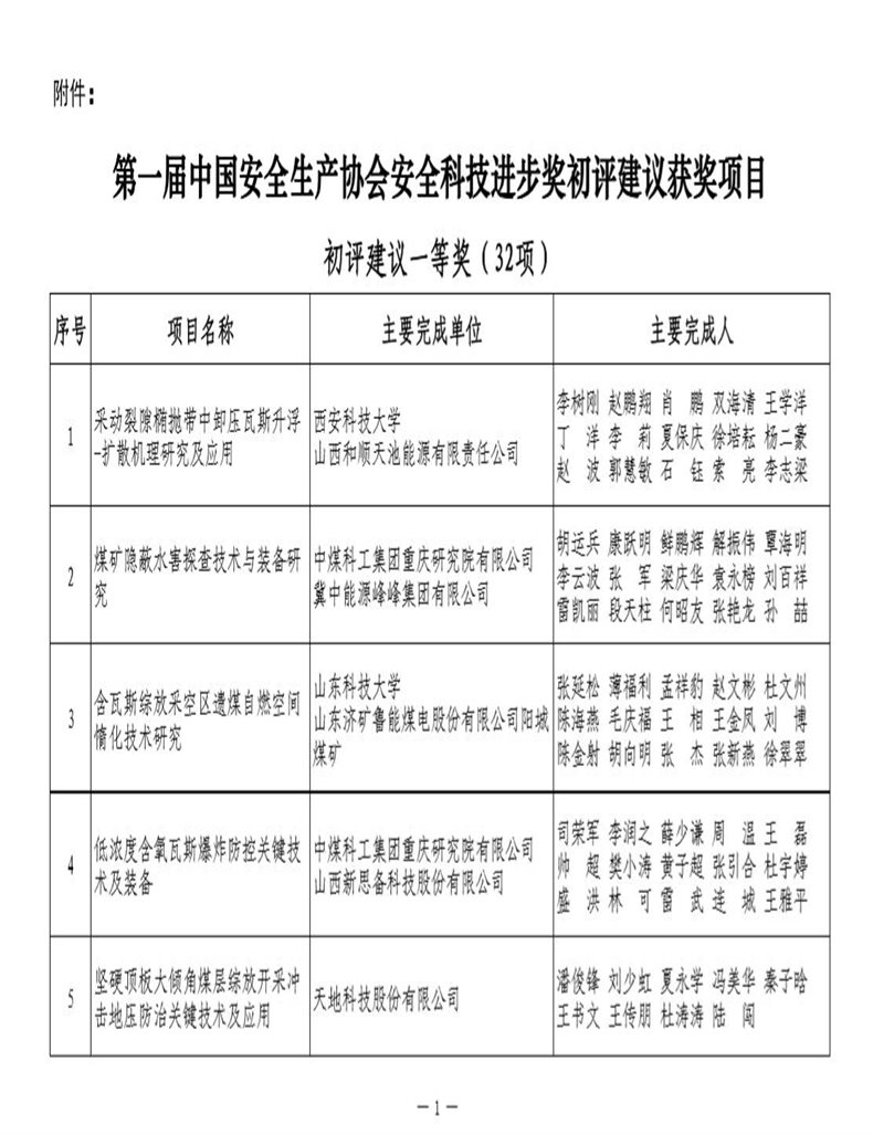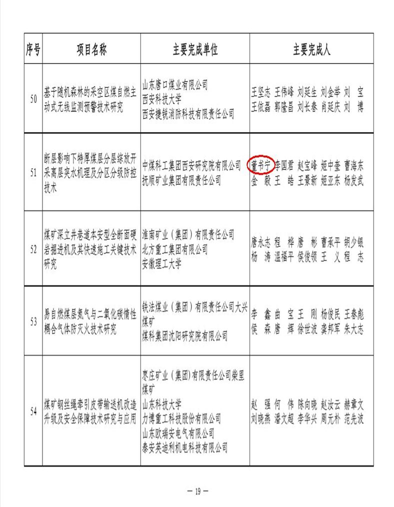 6.2019年中国职业安全健康协会科学技术一等奖--大型水体旁火烧区帷幕注浆采煤保水技术研究,排名第1;