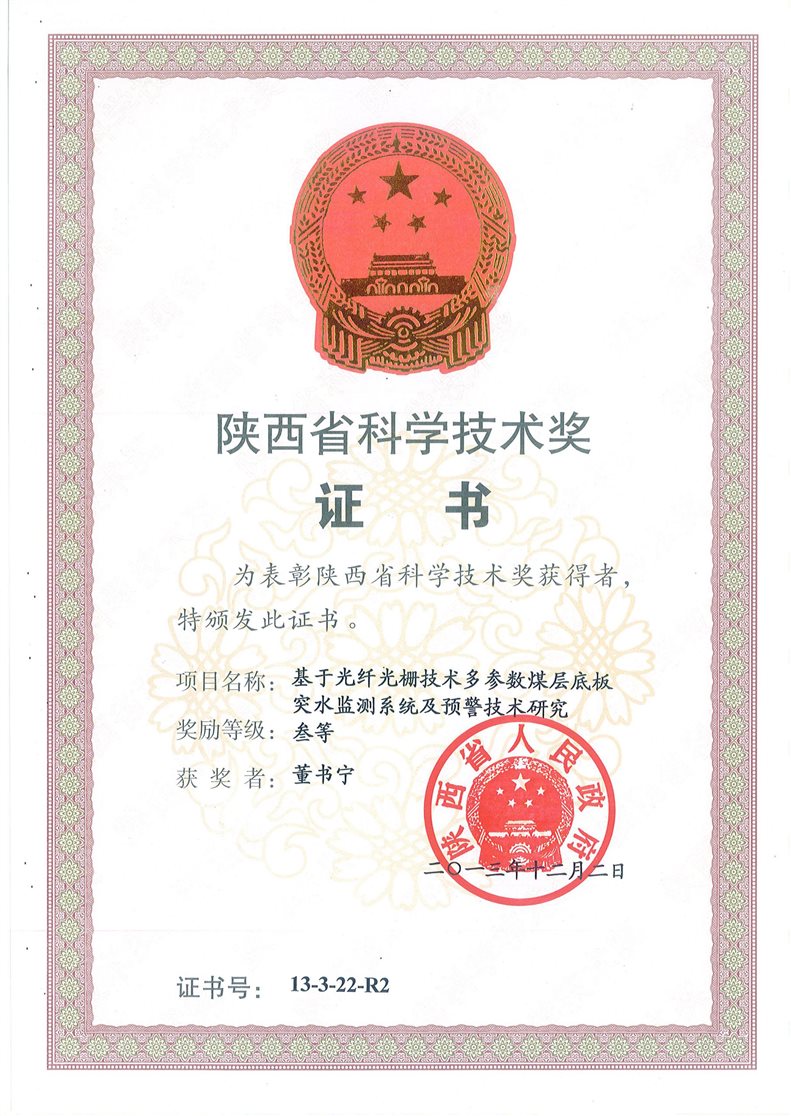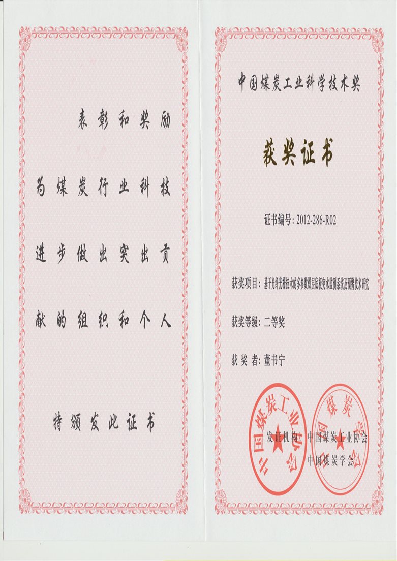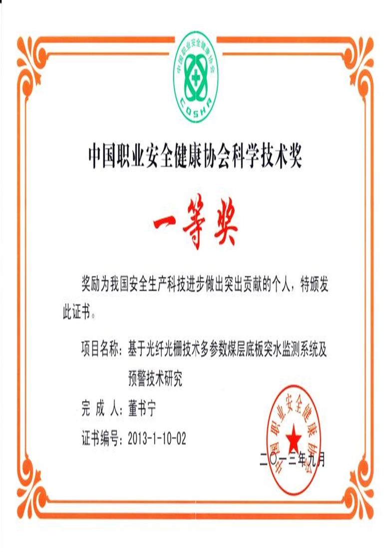 12.2013年中国职业安全健康协会科学技术一等奖--基于光纤光栅技术多参数煤层底板突水监测系统及预警技术研究,排名第2;