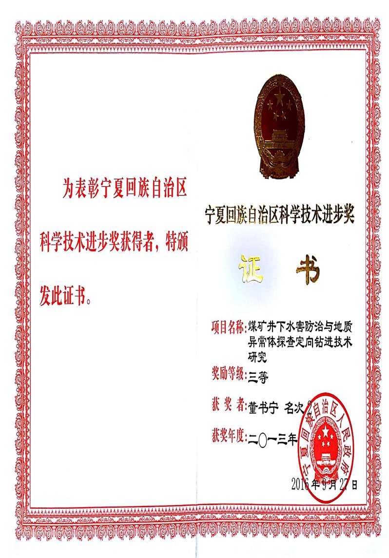 24.2013年度宁夏回族自治区科学技术进步三等奖--煤矿井下水害防治与地质异常体探查定向钻进技术研究,排名第2;