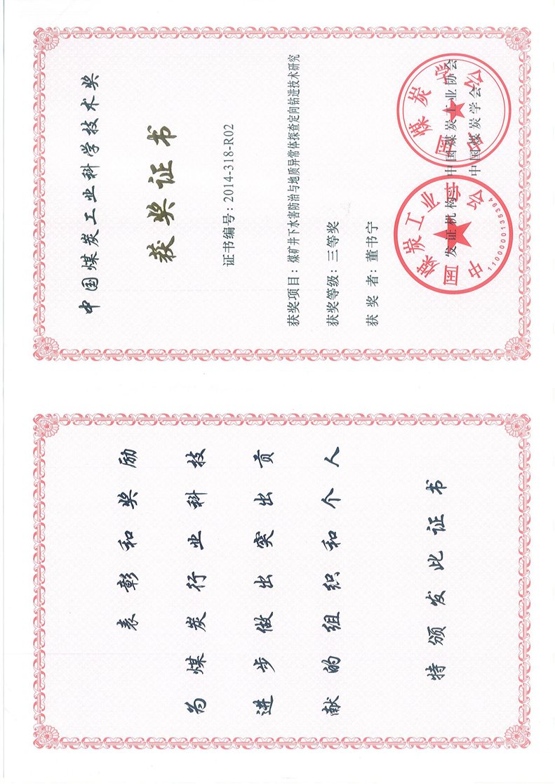 23.2014年中国煤炭工业科学技术三等奖--煤矿井下水害防治与地质异常体探查定向钻进技术研究,排名第2;