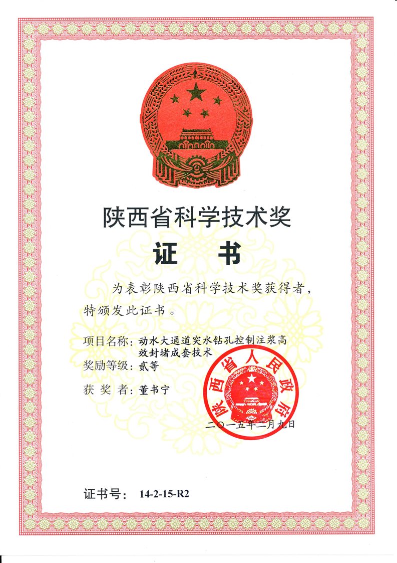 16.2014年陕西省科学技术进步二等奖--动水大通道突水钻孔控制注浆高效封堵成套技术,排名第2;