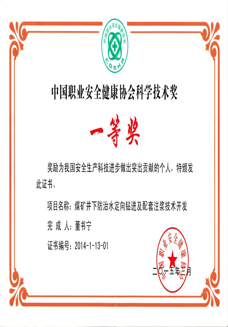 10.2014年中国职业安全健康协会科学技术一等奖--煤矿井下防治水定向钻进及配套注浆技术开发,排名第1;