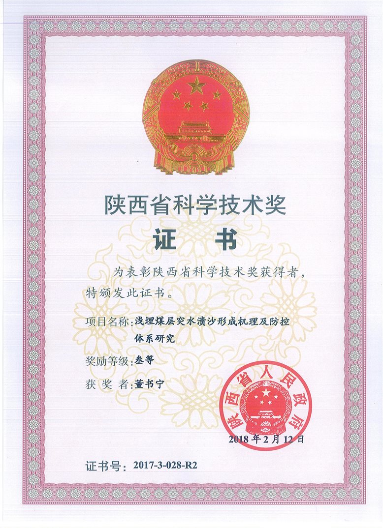 22.2017年陕西省科学技术进步三等奖--浅埋煤层突水溃沙形成机理及防控体系研究,排名第2;