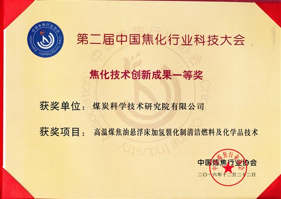 6 | 高温煤焦油悬浮床加氢裂化制清洁燃料及化学品技术 | 第二届中国焦化行业科技大会奖 | 一等奖 | 2016 |