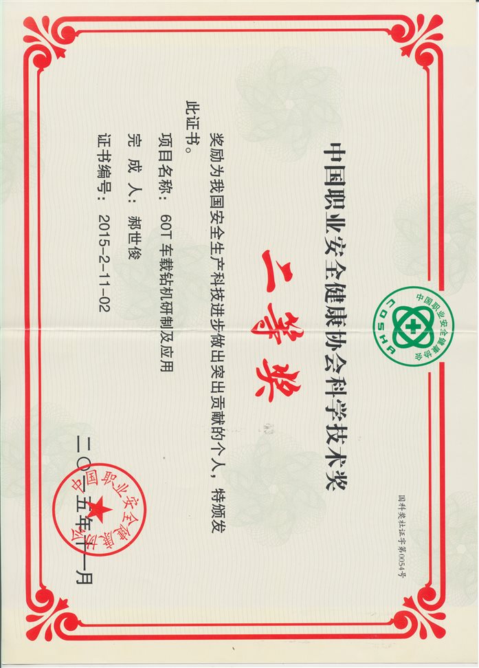 (10)60T车载钻机研制及应用,中国职业安全健康协会,中国职业安全健康协会科学技术奖,二等奖,2015年,排名第2