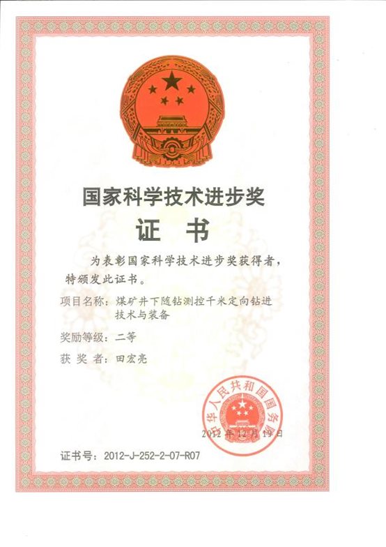[8] 煤矿井下随钻测控千米定向钻进技术与装备,中华人民共和国国务院,国家科学技术进步奖,二等奖,2012年,排名第7