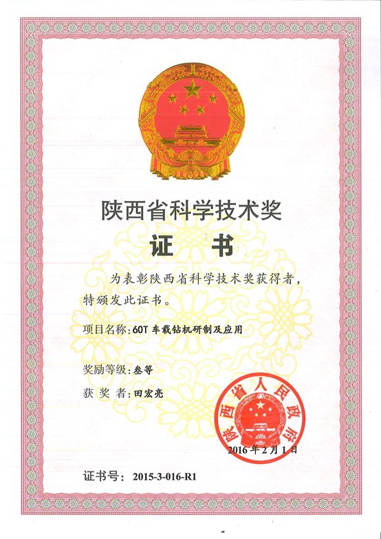 [10] 60T车载钻机研制及应用,陕西省人民政府,陕西省科学技术奖,三等奖,2015年,排名第1
