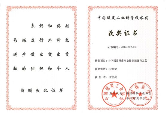 [9] 井下深孔绳索取心钻探装备与工艺,中国煤炭工业协会,中国煤炭工业科学技术奖,二等奖,2014年,排名第1