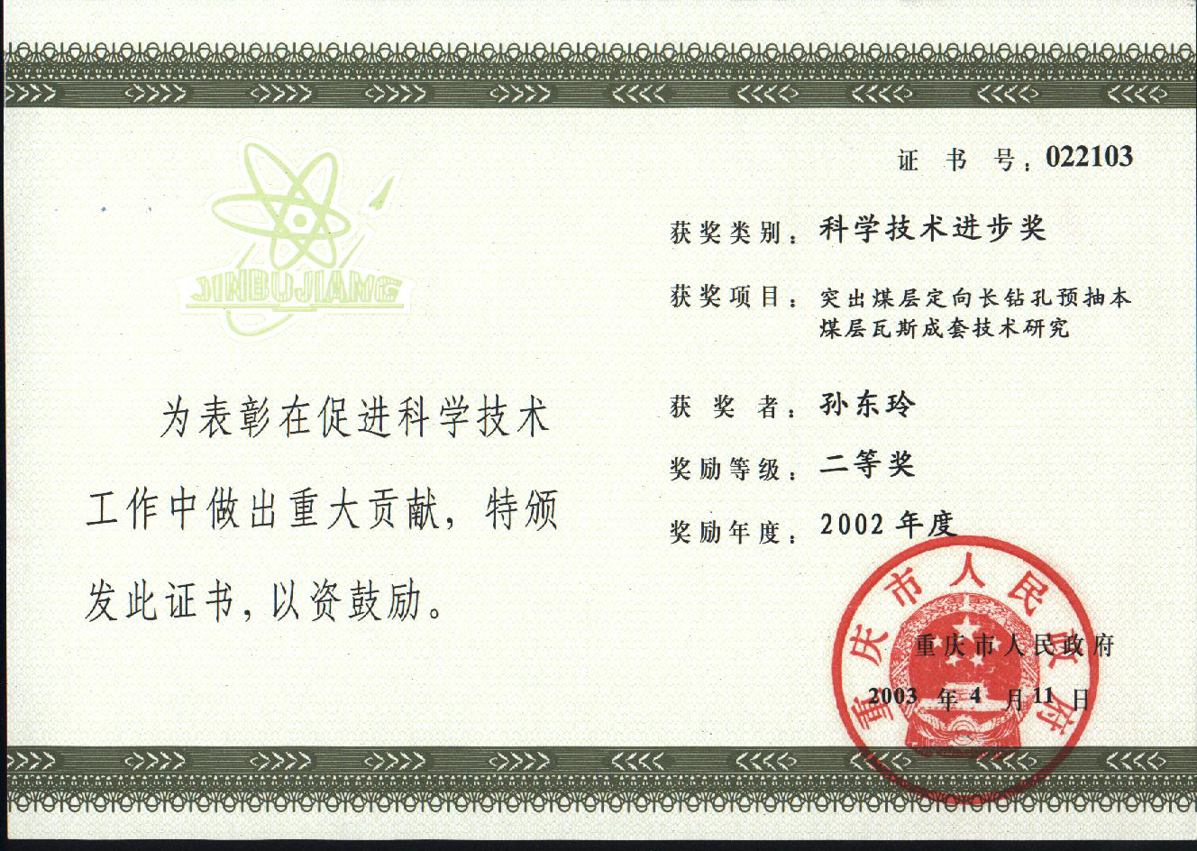 [7]2003年“突出煤层定向长钻孔预抽本煤层瓦斯成套技术研究”获重庆市科技进步奖二等奖