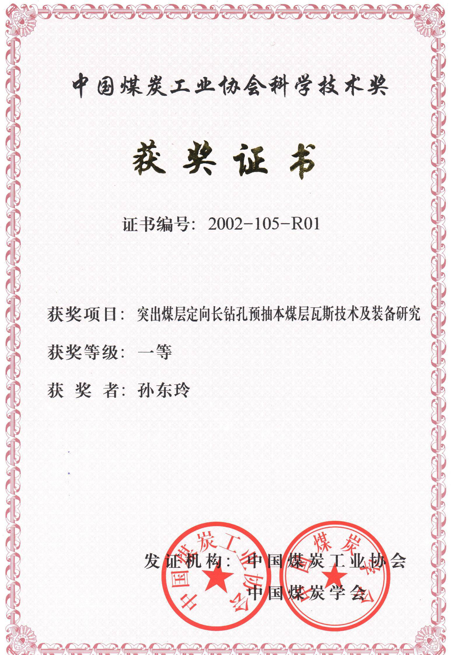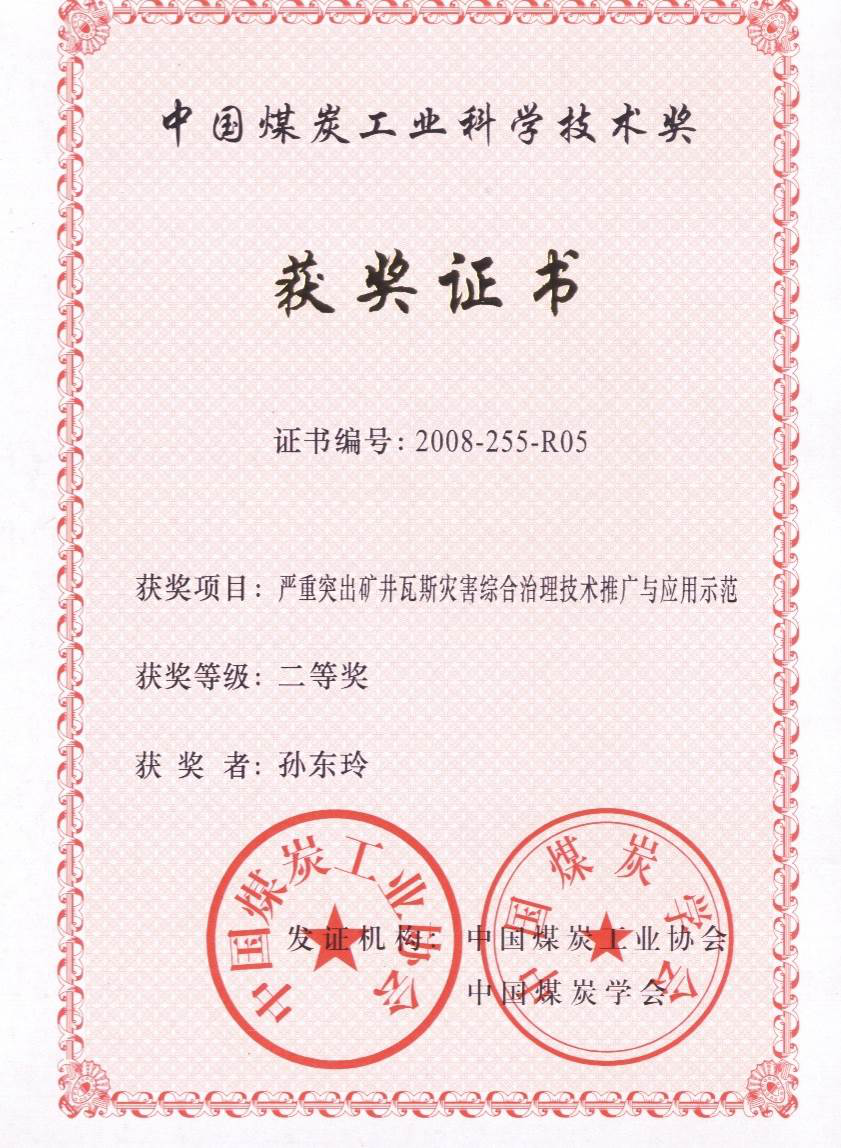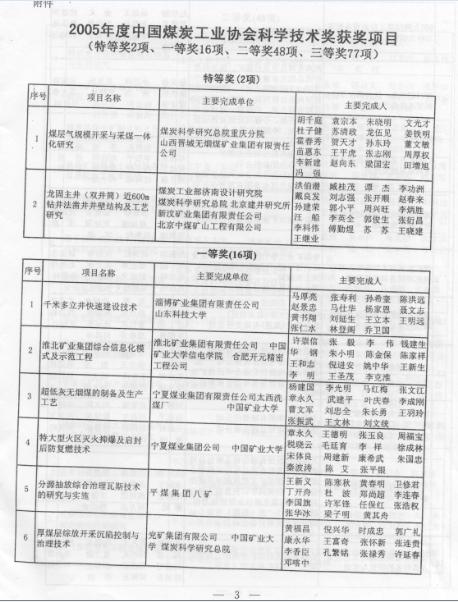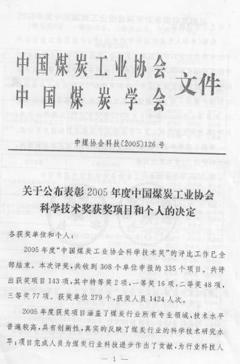 [1]2002年“突出煤层定向长钻孔预抽本煤层瓦斯技术及装备研究”获中国煤炭工业科学技术奖一等奖