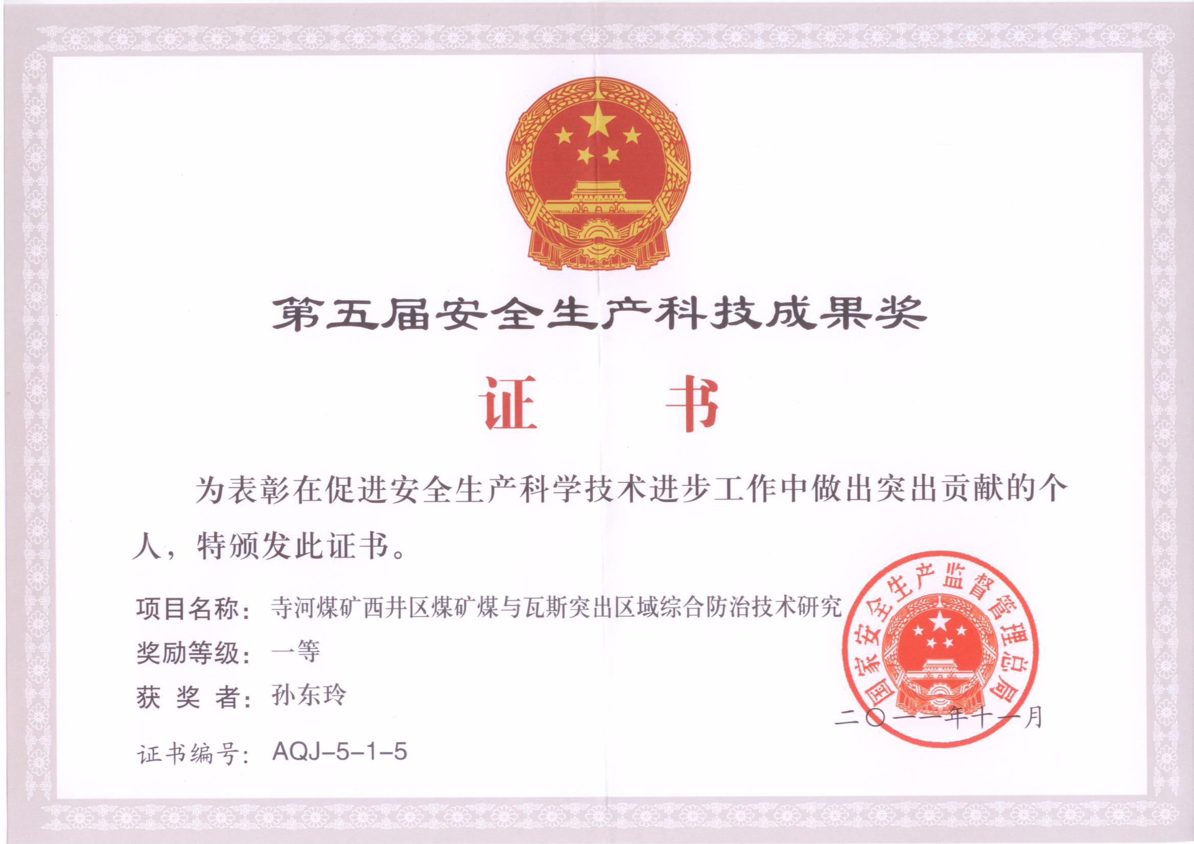 [5]2011年“寺河煤矿西井区煤矿煤与瓦斯突出区域综合防治技术研究”获第五届安全生产科技成果奖一等奖