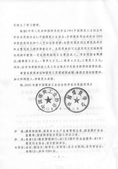 [9]2000年“严重突出矿井综合防突和瓦斯治理技术的研究”获煤炭工业科技进步奖二等奖