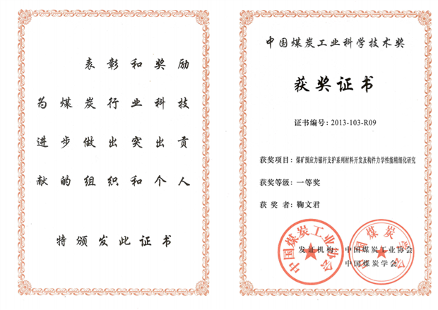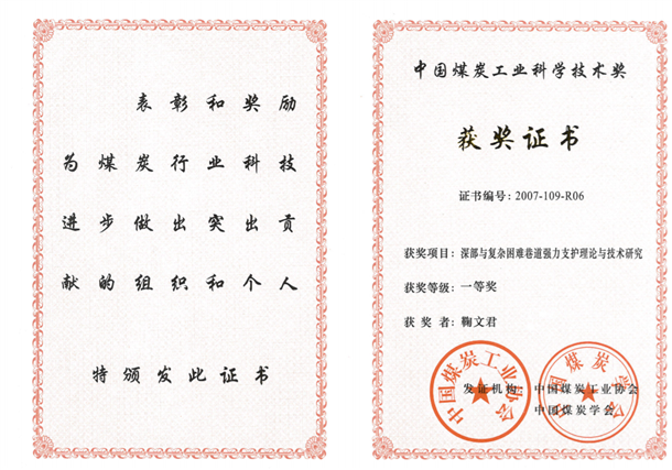 1、煤矿巷道高效安全支护成套技术创新体系及应用,国家科技进步二等奖,2005,排名10;