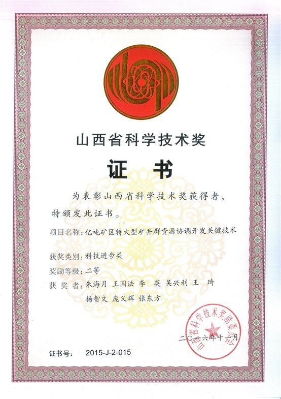3. 主持了特大型千万吨矿井群综采(放)成套装备系列型谱及优化配置技术研究项目,提出了特大型矿井群资源协调和安全高效可持续开发理念与评价模型,建立了特大型矿井群装备系列型谱,开发了综采设备选型优化系统,实现了设备投入产出比的最优化,获省部级二等奖。