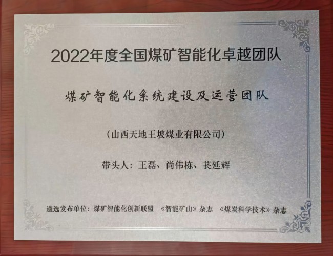 在近日召开的“2022年度全国煤矿智能化重大进展发布会”上,天地王坡“煤矿智能化系统建设及运营团队”喜获“2022年度煤矿智能化卓越团队”。